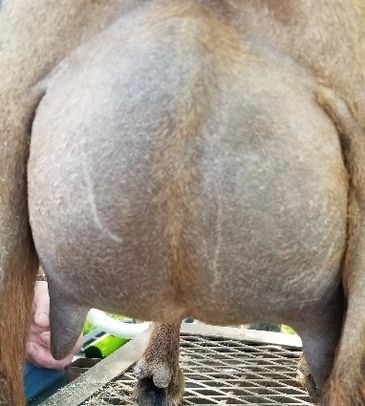 Named after my dear friend Darla McClung this little lady is very special to me. I LOVE her look. She is absolutely freight train long and more level than this picture indicates. Darla had a traumatic kidding this go round so most likely will dry her off early and see what she can do next year! This is a lovely blending of some of our favorite old lines. This is a horrible udder picture taken after a very rough kidding. We decided to dry her off and try again for next season.